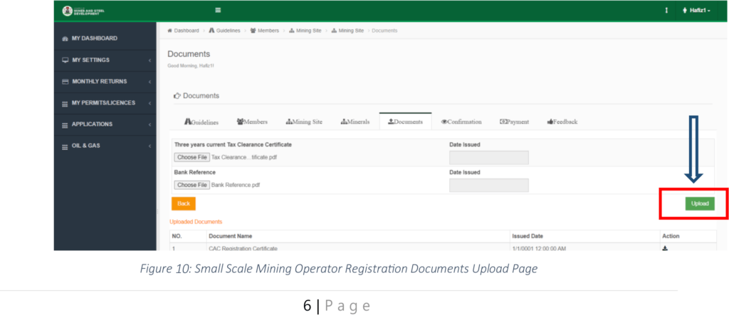 Step 10: The system displays the Documents upload page, some required documents have been uploaded already Upload the remaining required documents and click “Upload” button to upload as shown in Figure 10 below;
