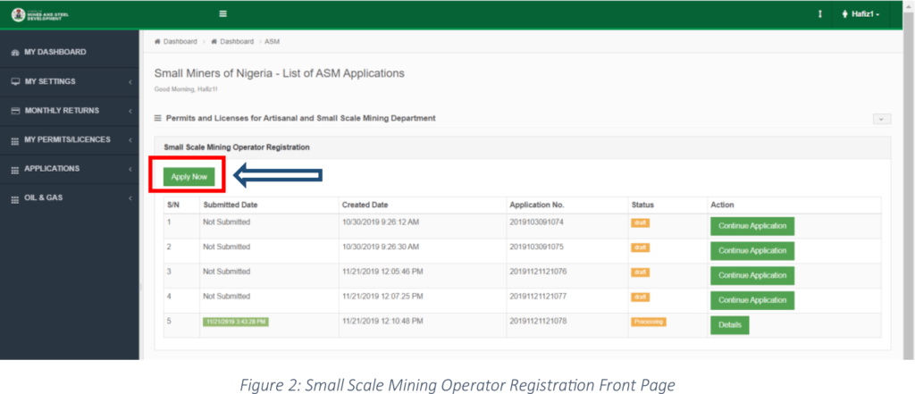 Step 2: The system displays the List of ASM Applications, scroll down to the Small Scale Mining Operator Registration and click Apply Now button under it as shown in Figure