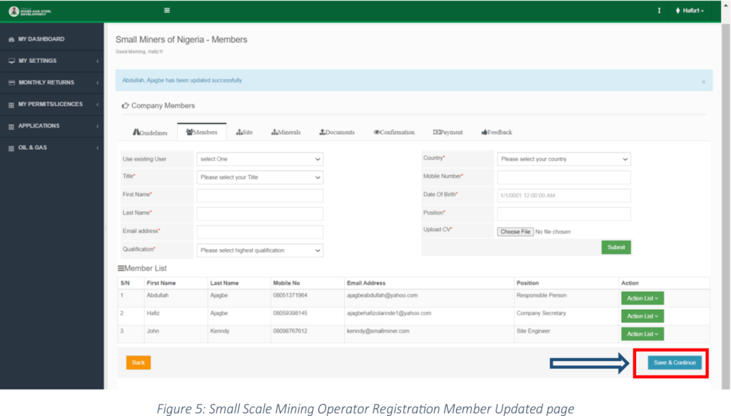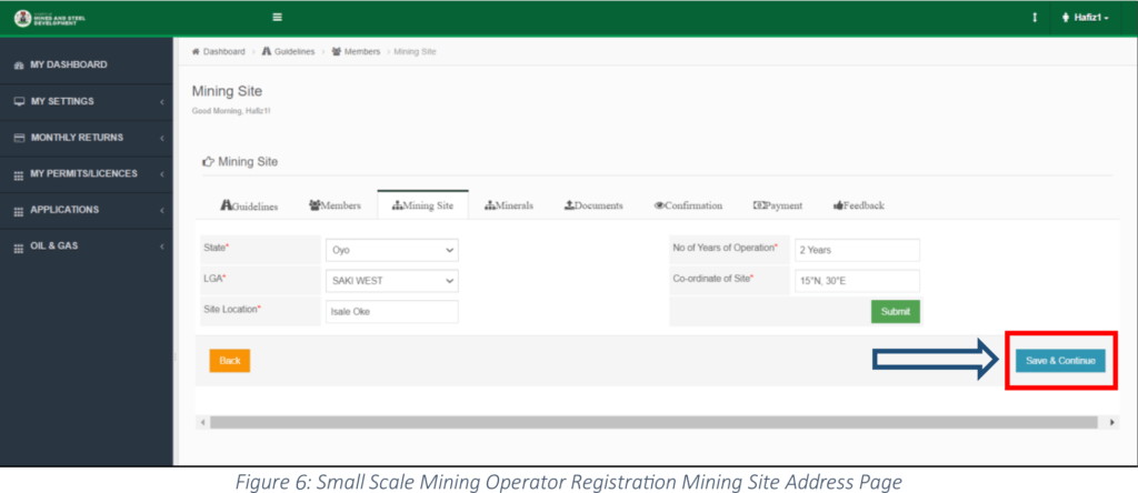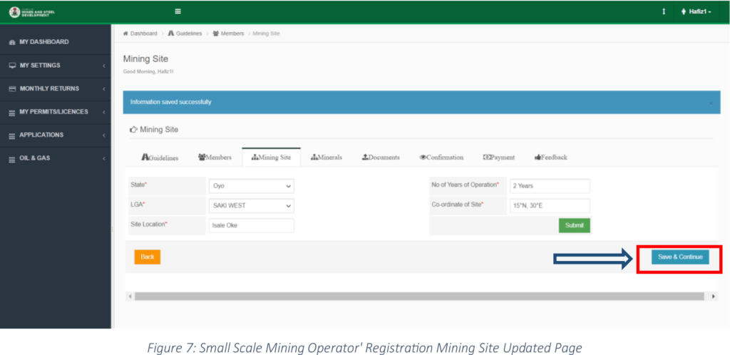 Step 7: The system saved the Mining Site details successfully, click on the “Save & Continue” button to continue with the application as shown in Figure 7 below;