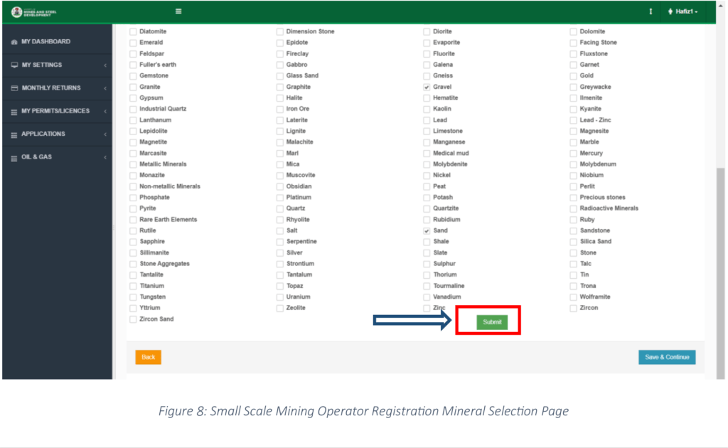 Step 8: The system displays the Minerals Page, select the relevant minerals and scroll down to the bottom of the page to click on the “Submit” button as shown in Figure 8 below