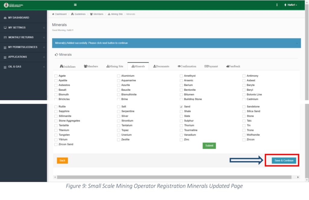 Step 9: The system added the selected minerals successfully, click the “Save & Continue” button to proceed with the application as shown in Figure 9 below